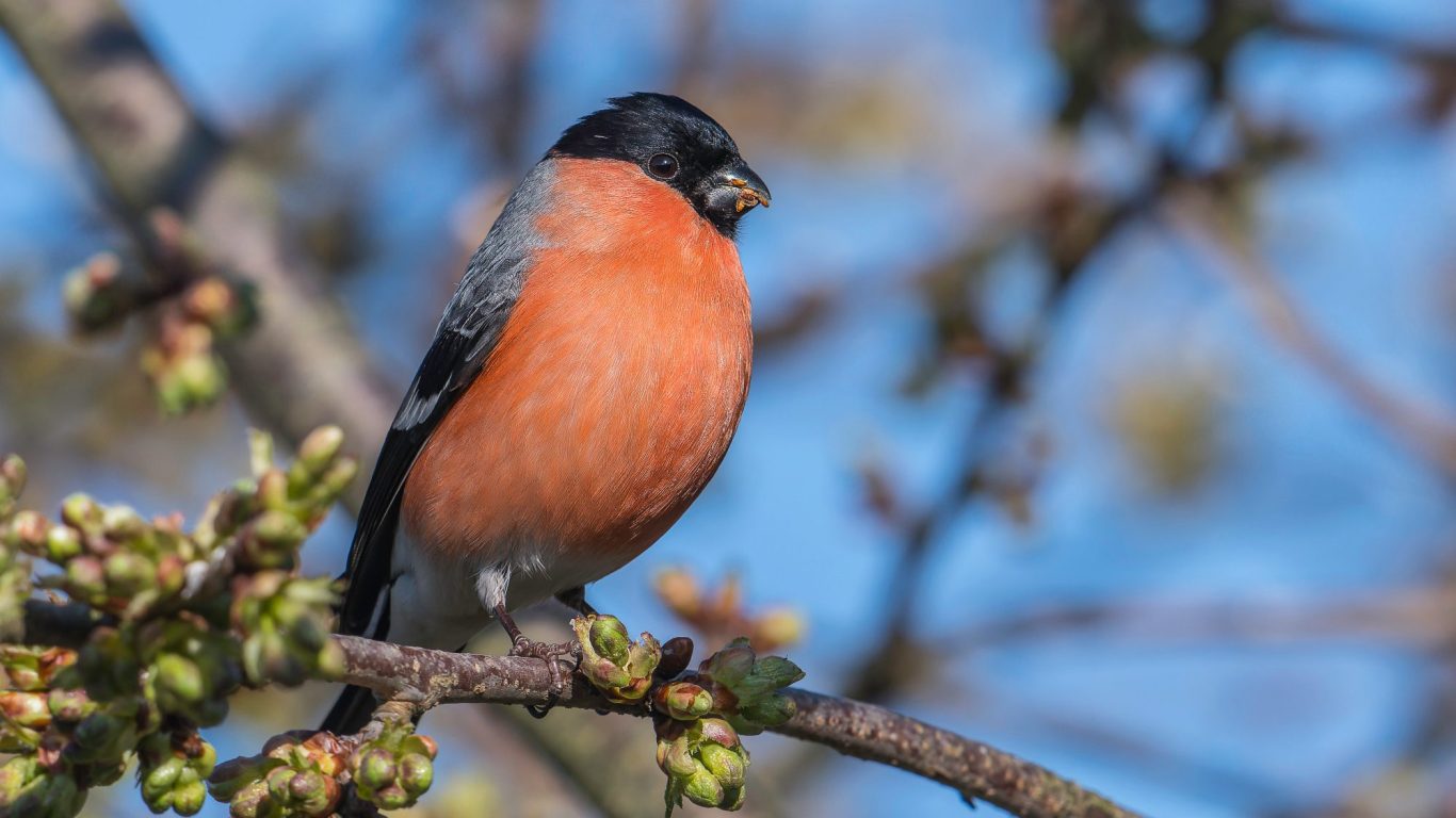 Der breite, kegelförmige schwarze Schnabel des Finkenvogels hat scharfe Kanten und eignet sich besonders gut zum Zerquetschen der Beeren und Samen. Neben dem Eisvogel gehört er zu den farbenprächtigsten Brutvögeln im Naturschutzgebiet „Große Wiese“.